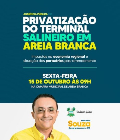 Na Sessão Plenária desta quinta-feira (14) na Assembleia Legislativa do Rio Grande do Norte, no horário destinado aos deputados, Souza (PSB) em seu discurso convocou todos a participarem da audiência pública que acontece nesta sexta-feira (15), às 9h, na Câmara Municipal de Areia Branca, para debater a privatização do Terminal Salineiro da cidade, o chamado Porto Ilha, e principalmente o destino dos trabalhadores portuários após seu arrendamento.